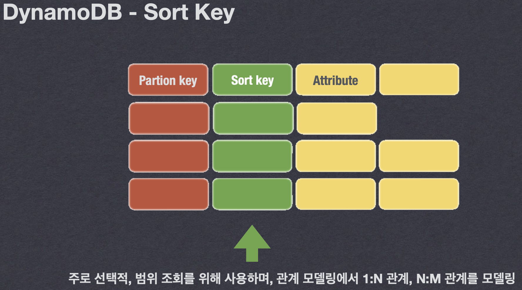 - Sort key를 사용시에는 복합키 구성이기에 파티션키를 중복으로 사용가능하다.